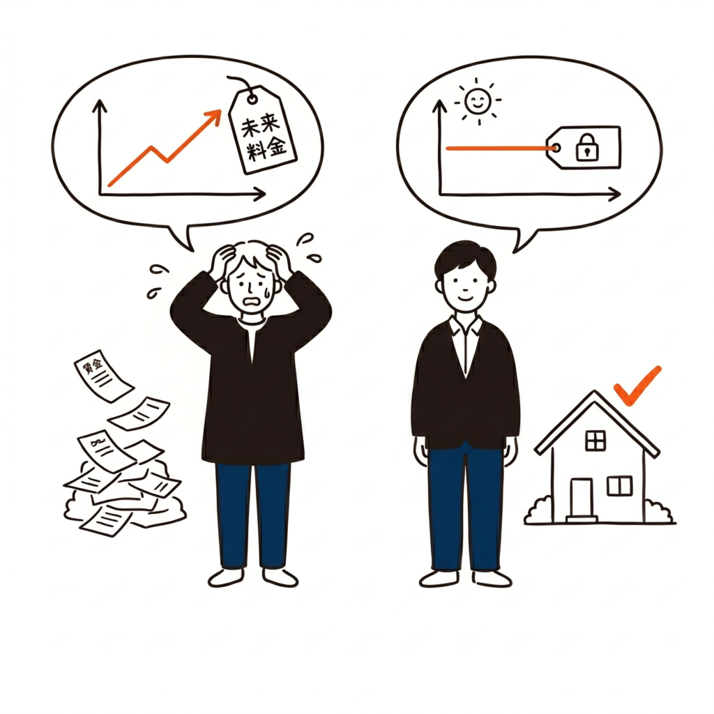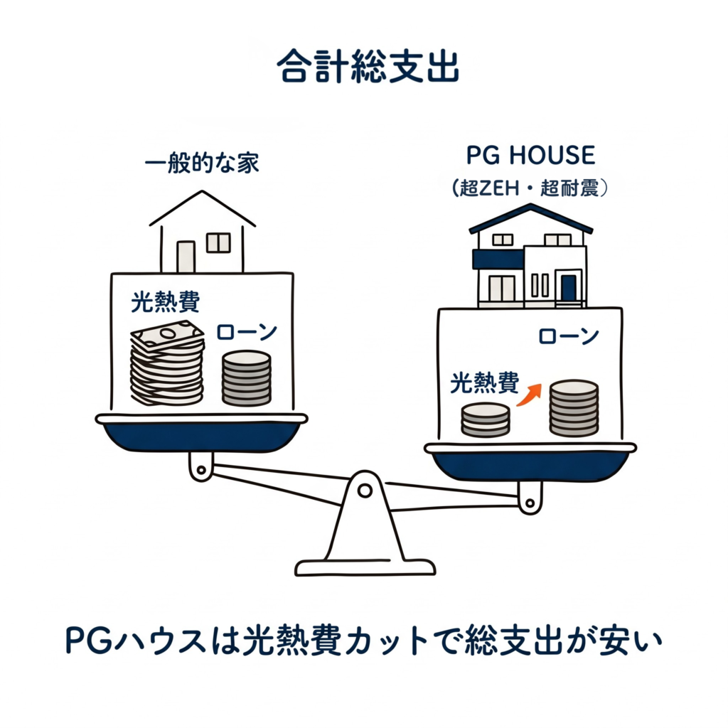 まず一番大きな関係があるのが「光熱費の削減」です。 PG HOUSEの家は高気密・高断熱の性能を誇ります。これにより、冷暖房の効率が飛躍的に上がり、毎月の電気代やガス代などの光熱費を大幅に落とすことができます。 もし金利が上がって、毎月の住宅ローンの支払いが数千円〜1万円ほど増えてしまったとします。しかし、光熱費がそれ以上に安くなれば、毎月のトータルの支出は結果的に安く抑えられます。これが、性能の低い家をただ安く建てるよりも、高性能なPG HOUSEで建てる最大のメリットです。