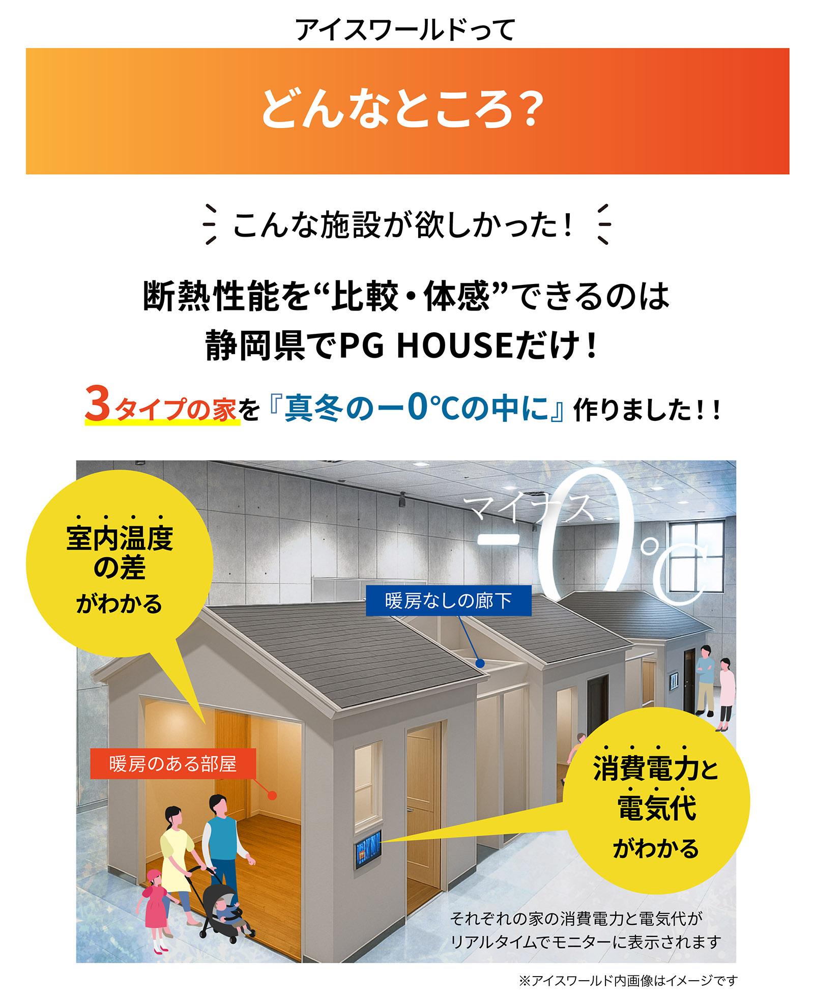 3タイプの断熱の違う家(建売・ローコスト住宅/高性能な家/超高性能な家)の室内温度の差を体感することができます。