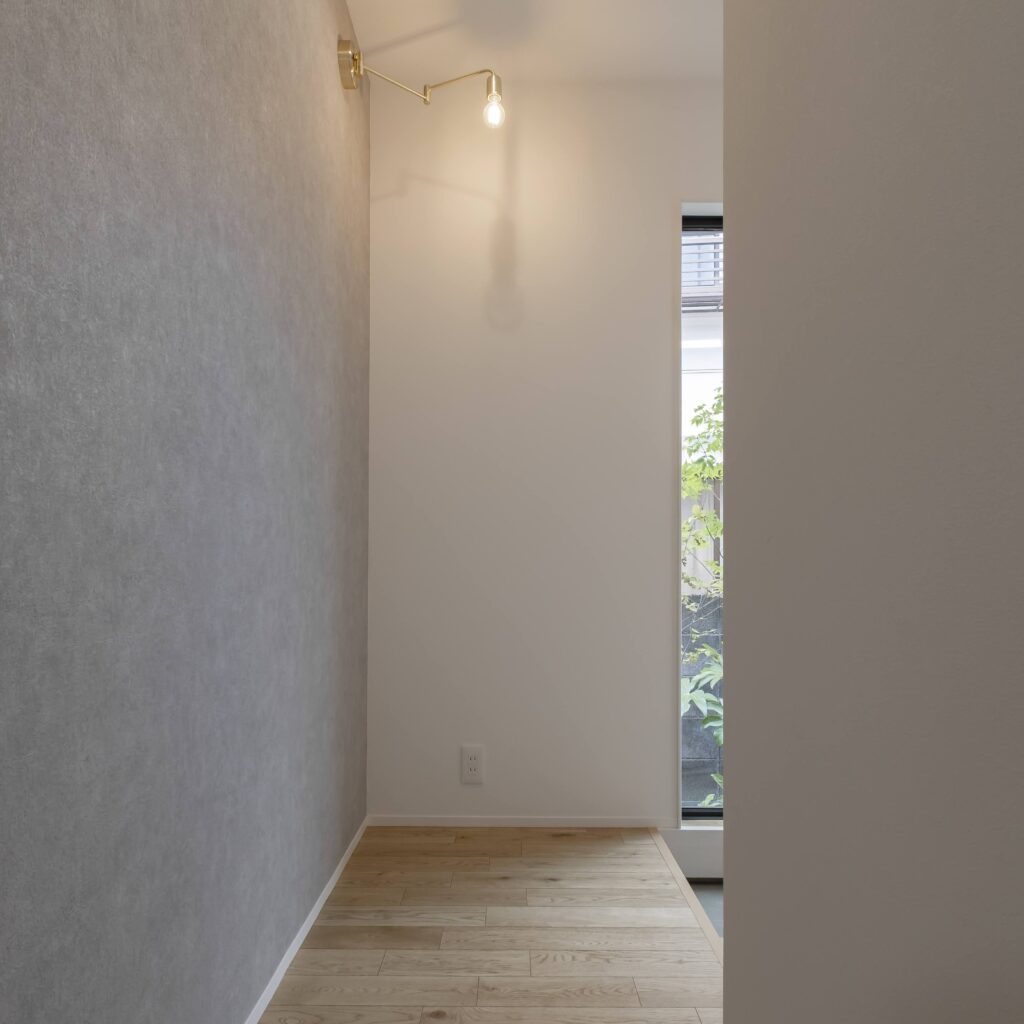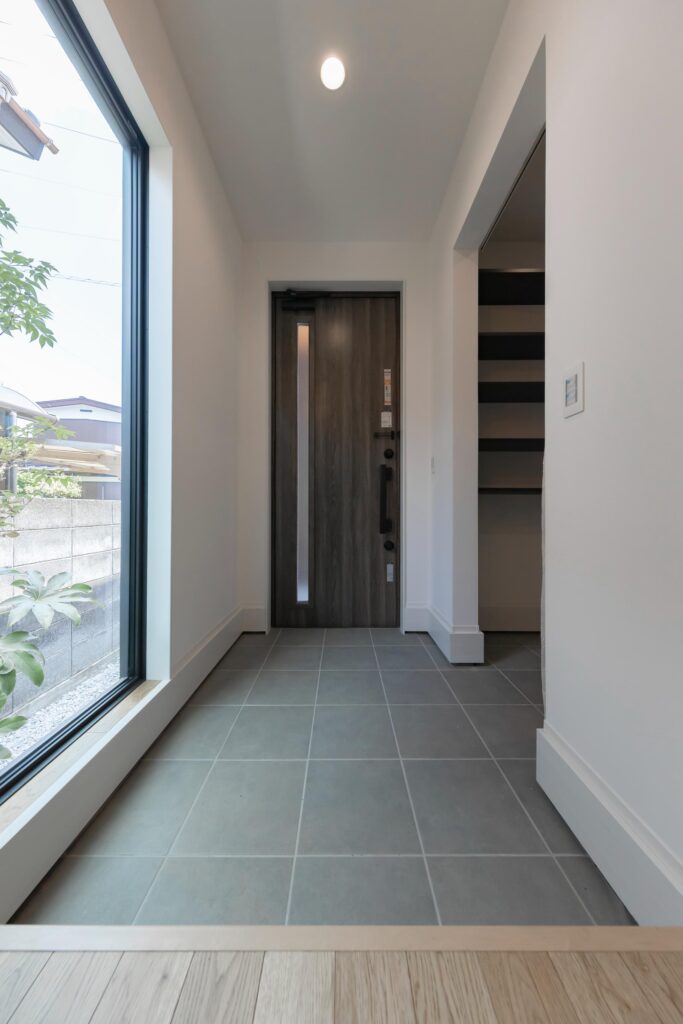 窓越しの緑が迎えるゆとりの玄関