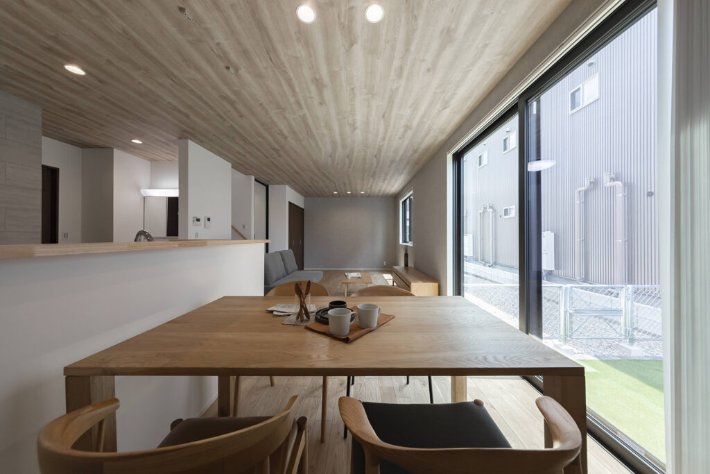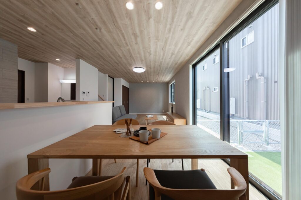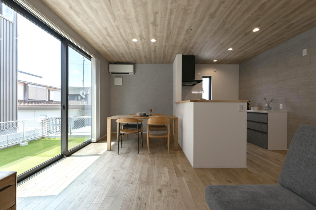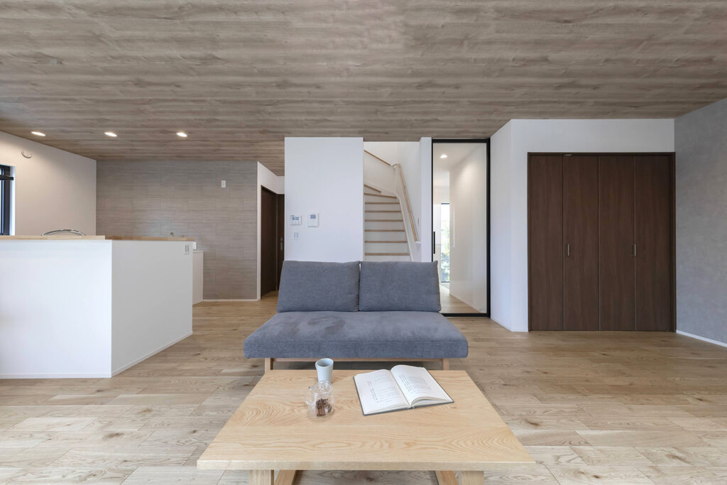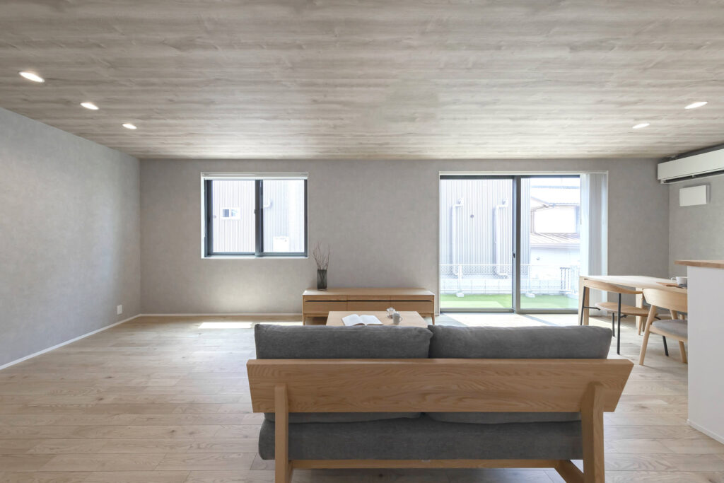 木目天井とグレーがつくる、落ち着きのある広々リビング
