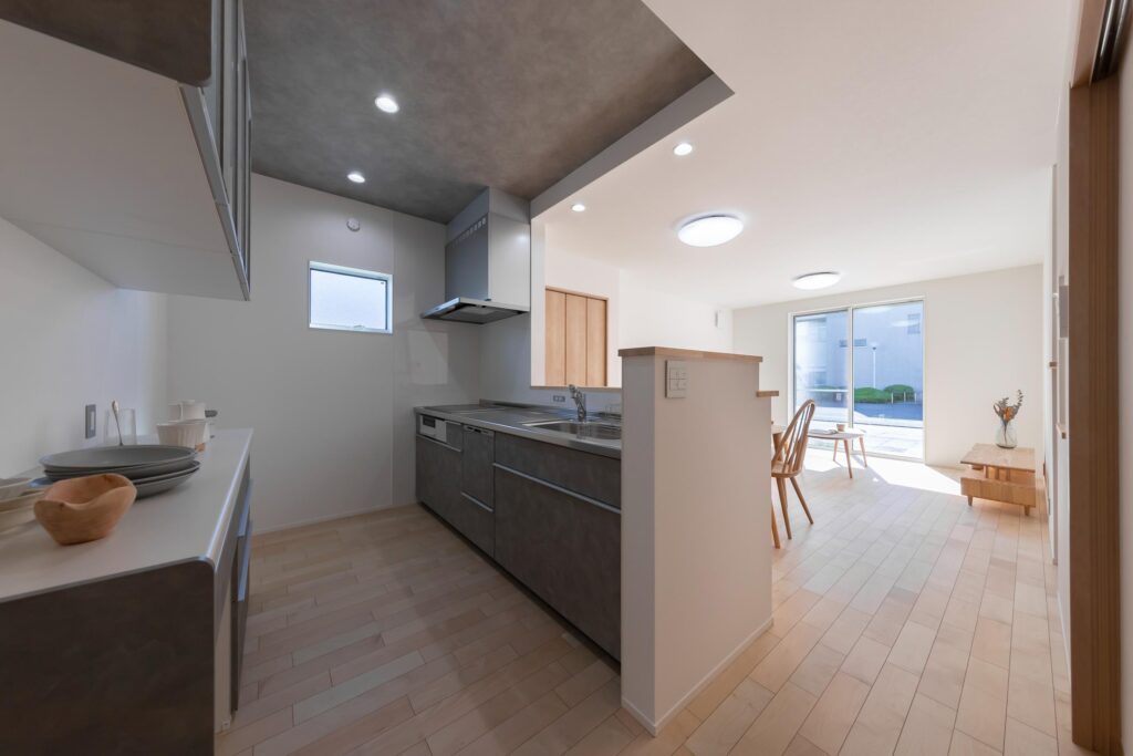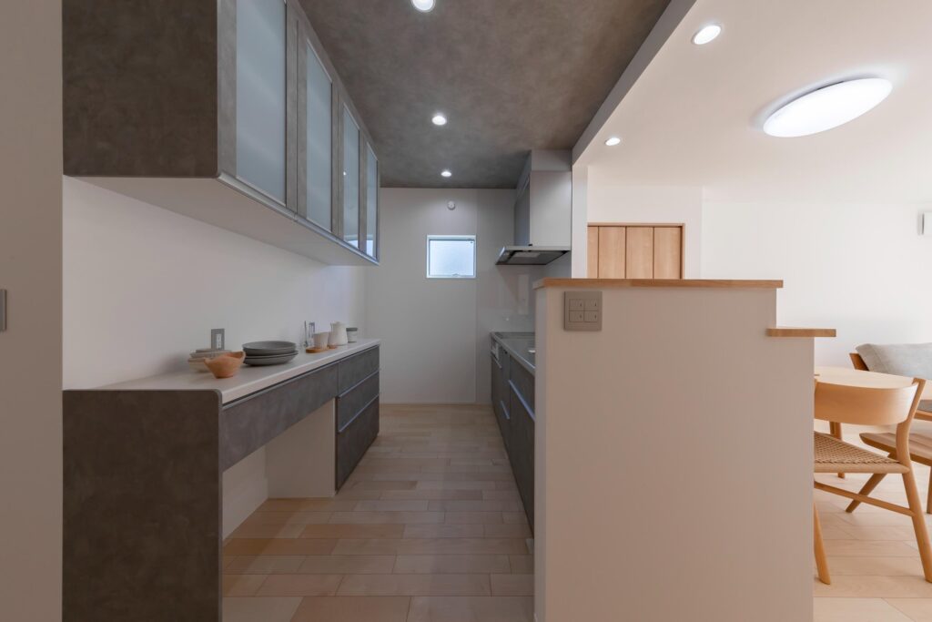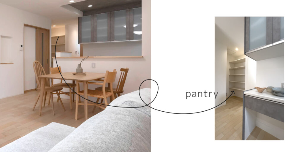 キッチン奥にパントリーを設けることで、いつもすっきりした印象のLDKに