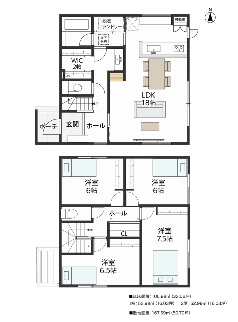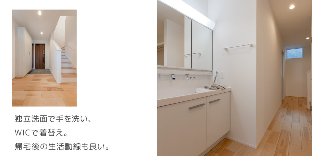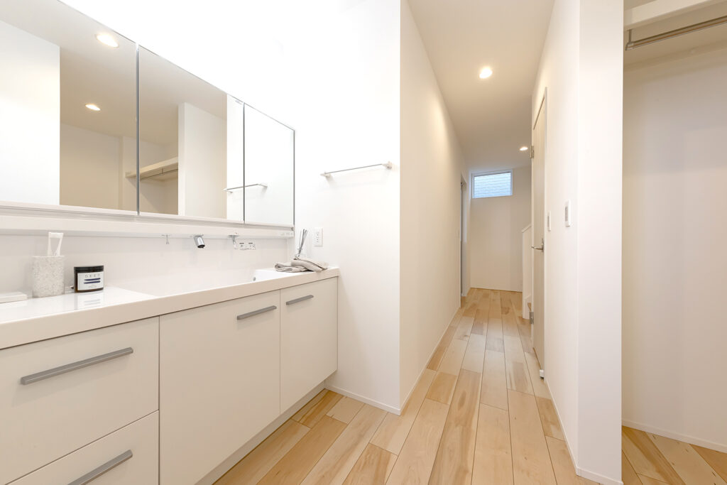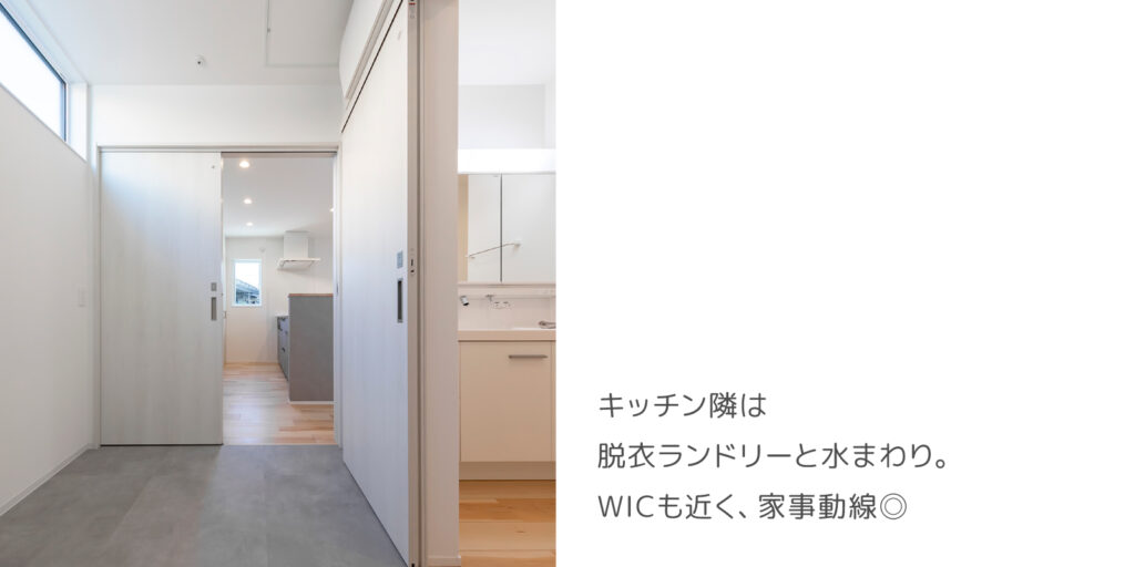 キッチン横にはランドリールームからWIC、洗面台、玄関へとつながる回遊動線を配置。忙しい子育て世代にうれしい、家事がスムーズに進む間取りです。
