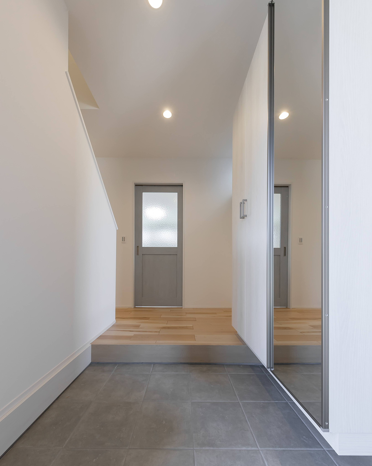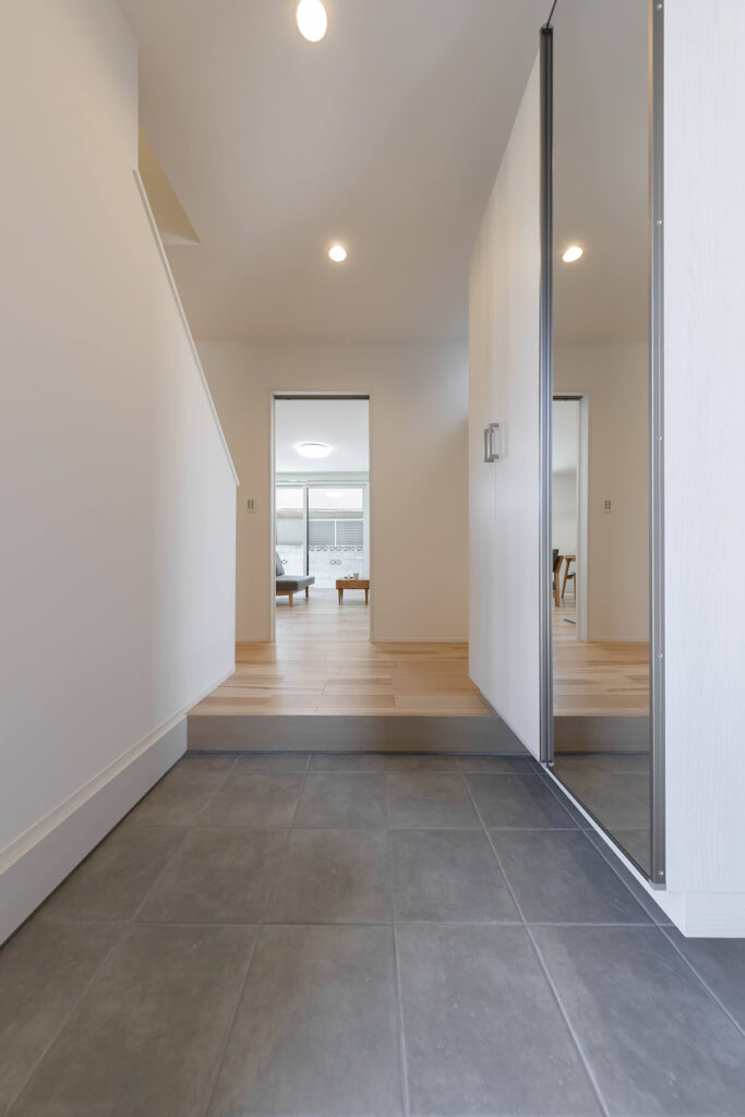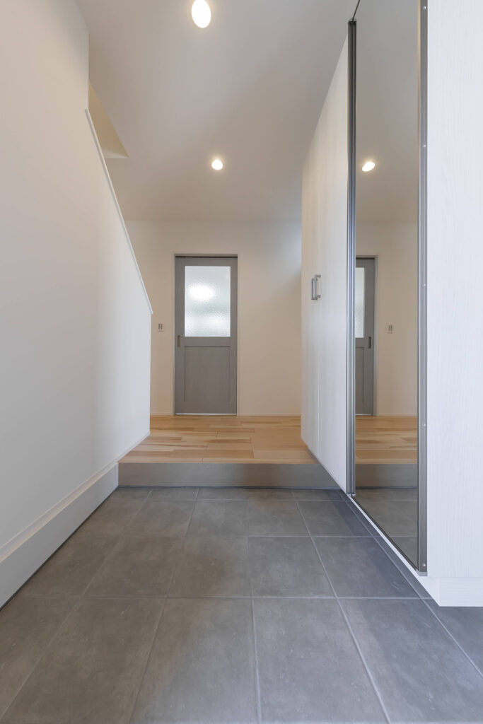 シンプルでモダンな玄関。正面のリビングにつながる扉もおしゃれなカフェのよう。右手には大きな全身鏡と大型シューズボックスがあり収納も十分。