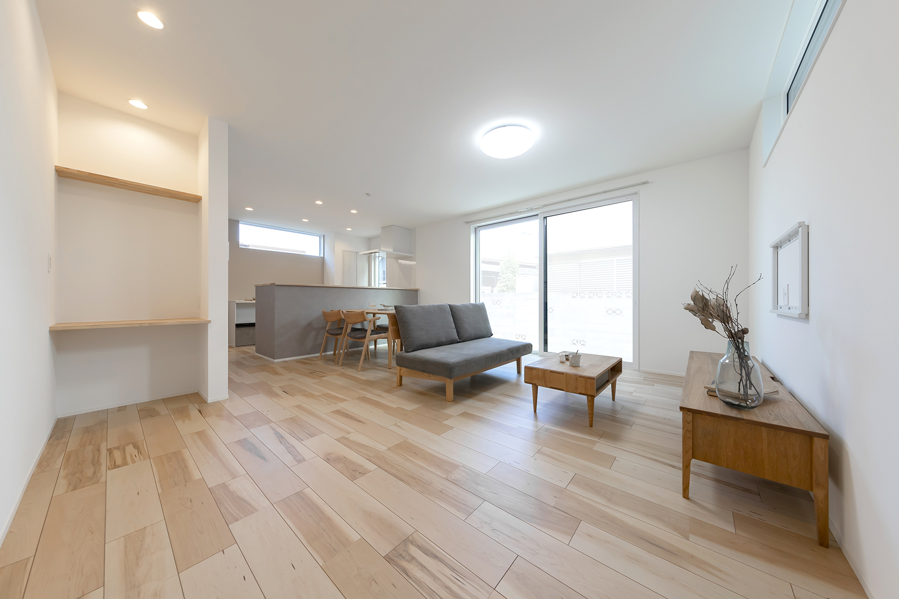 広々としたリビングダイニング。大きな窓から自然光が差し込み、温かみのあるインテリアでシンプルながらも洗練された空間。
