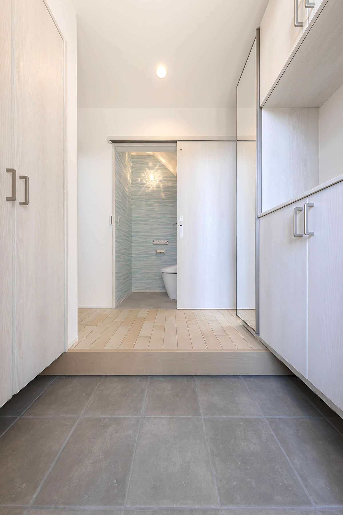 奥様が選んだ水色のクロスがやさしく空間を彩り、清潔感と個性が感じられる仕上がりに。こだわりの照明と合わせて、毎日気分が上がるトイレになりました。
