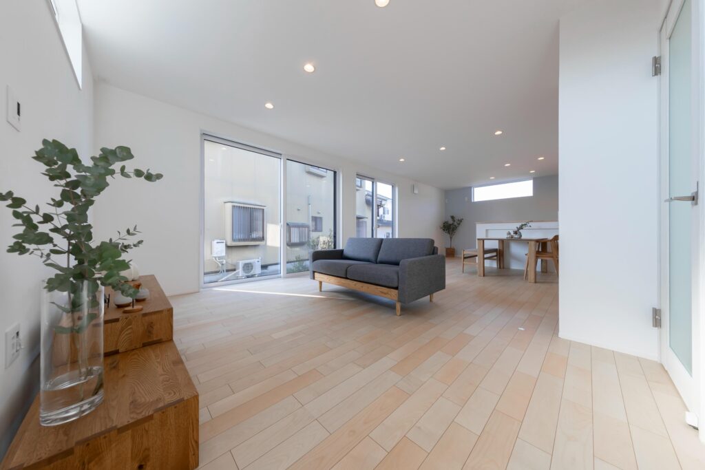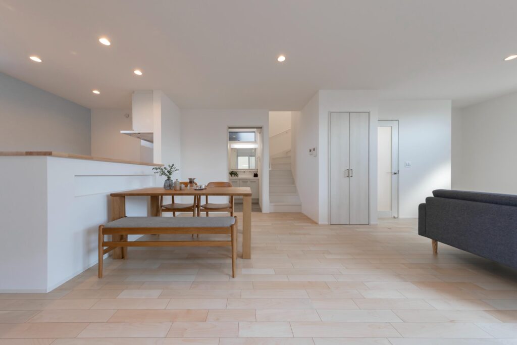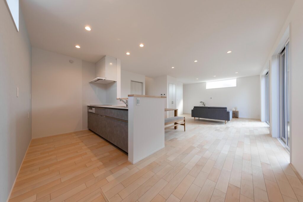 南側からの光が心地よく入る大空間のLDKは、家族が集まりやすい開放的なつくりで、広さとゆとりを感じられる空間です。