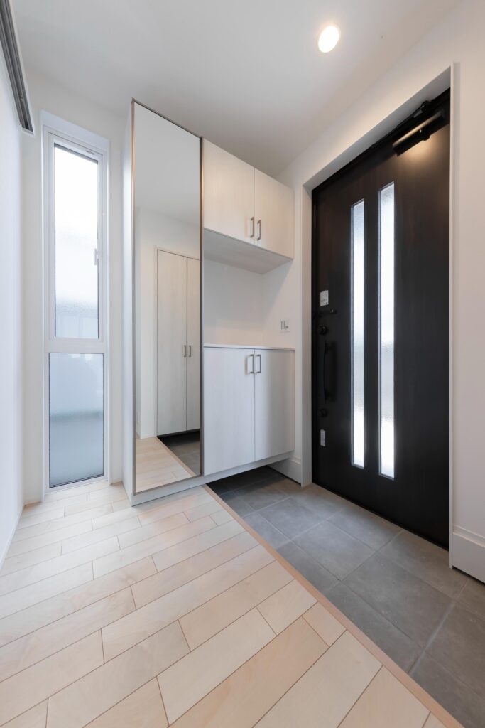使い慣れたお気に入りのカップボードに合わせて設計し、背面収納を隠せる仕様で生活感を抑えたすっきりとした印象に。毎日の家事がしやすい動線も魅力です。