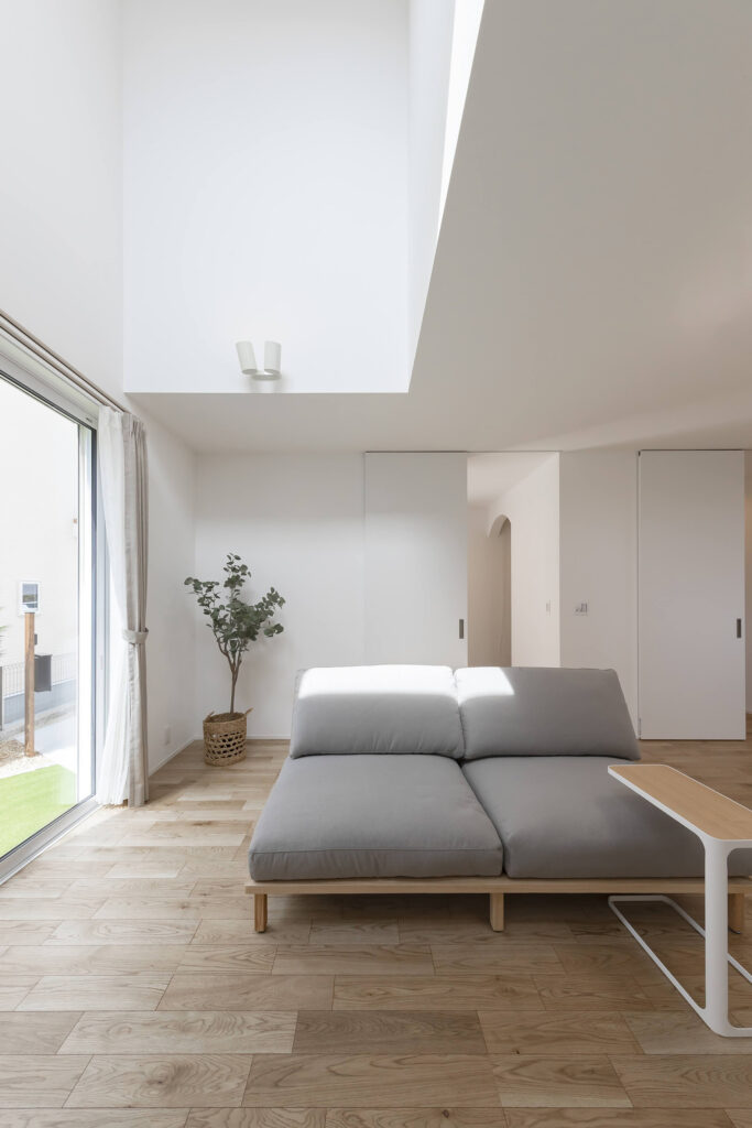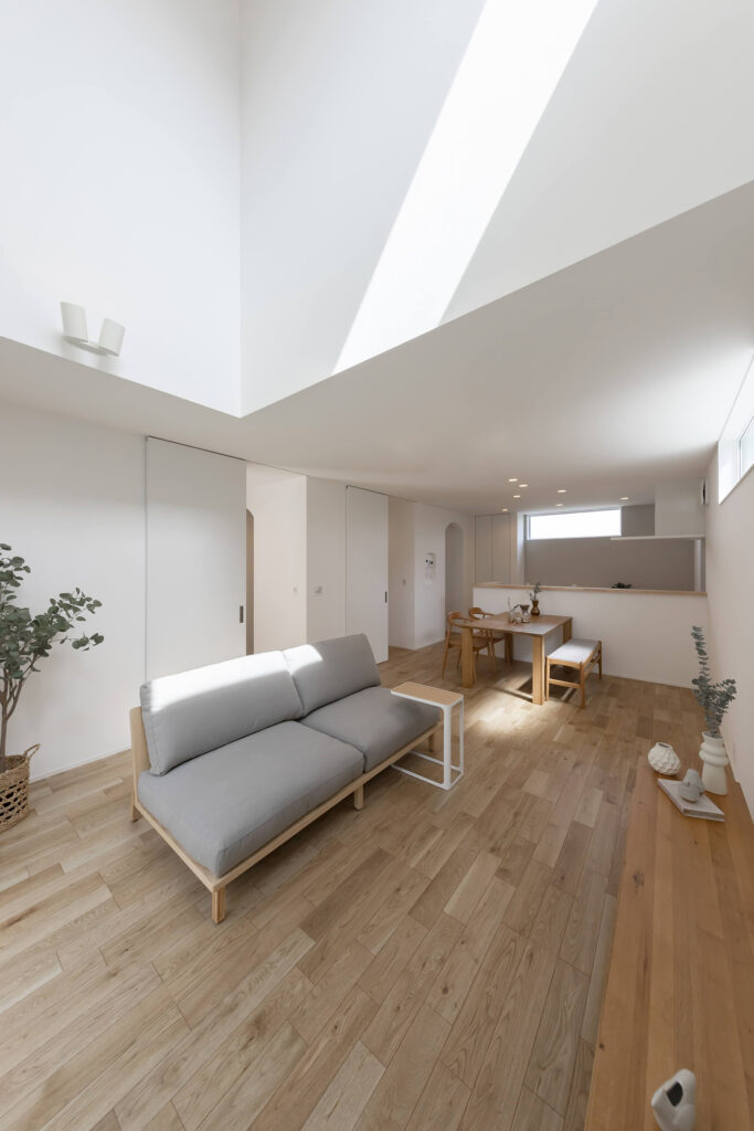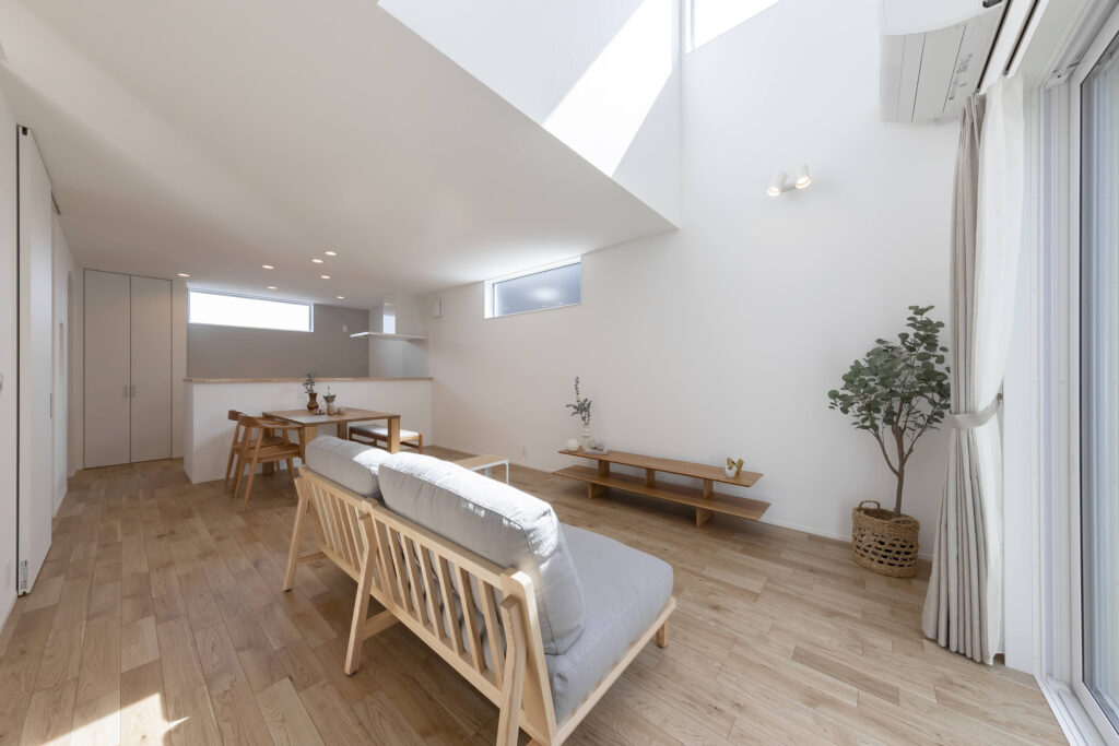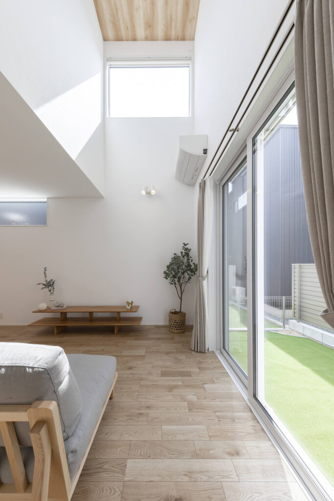 天井が高く開放感のあるリビング。大きな窓から自然光が降り注ぎ、明るく快適な空間