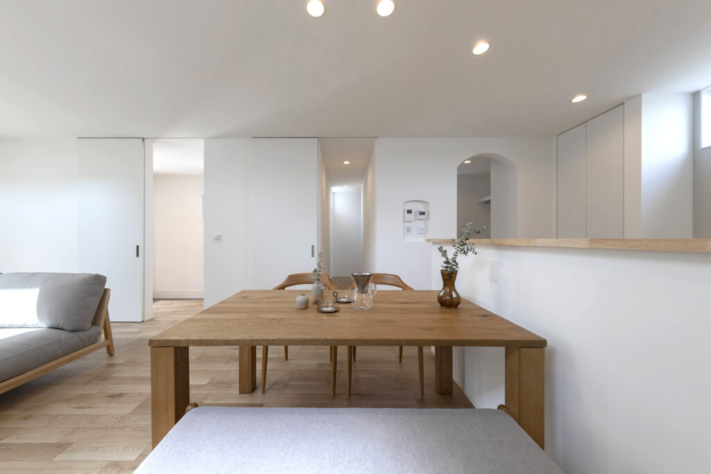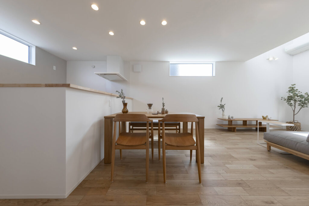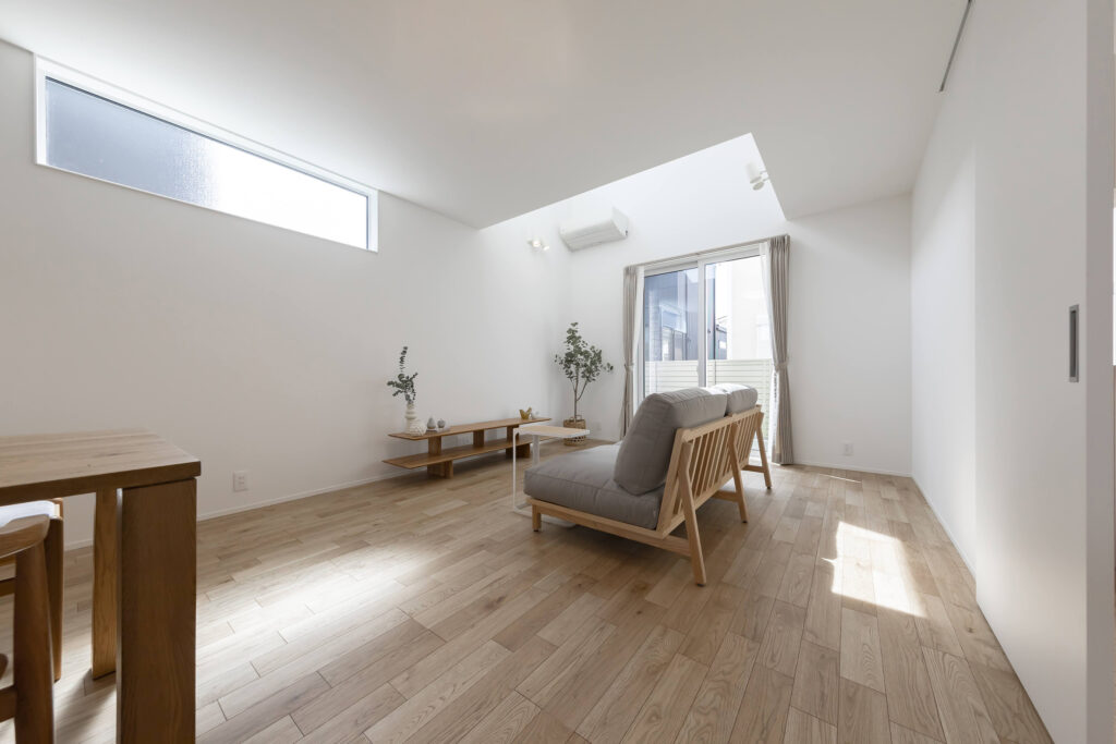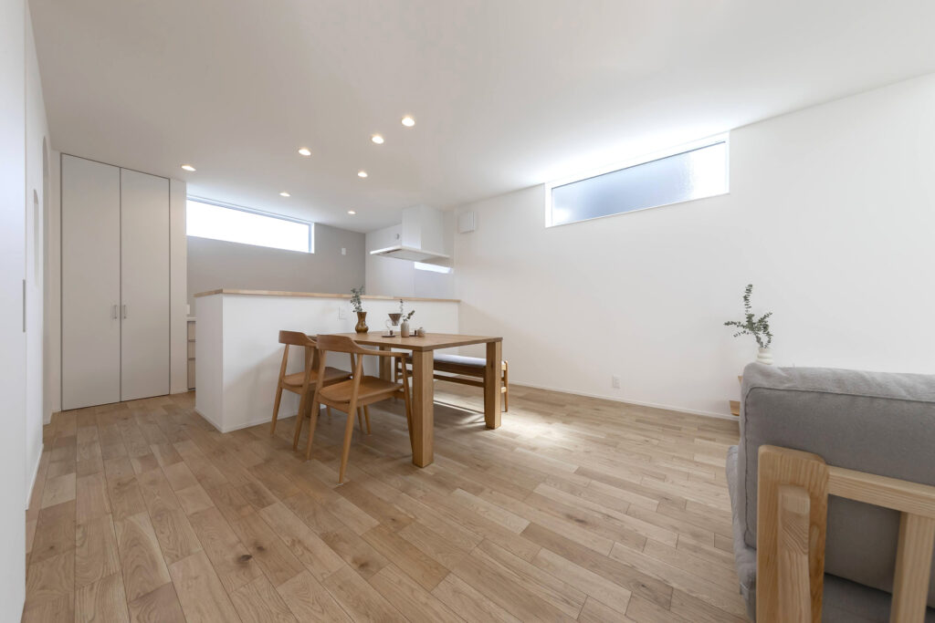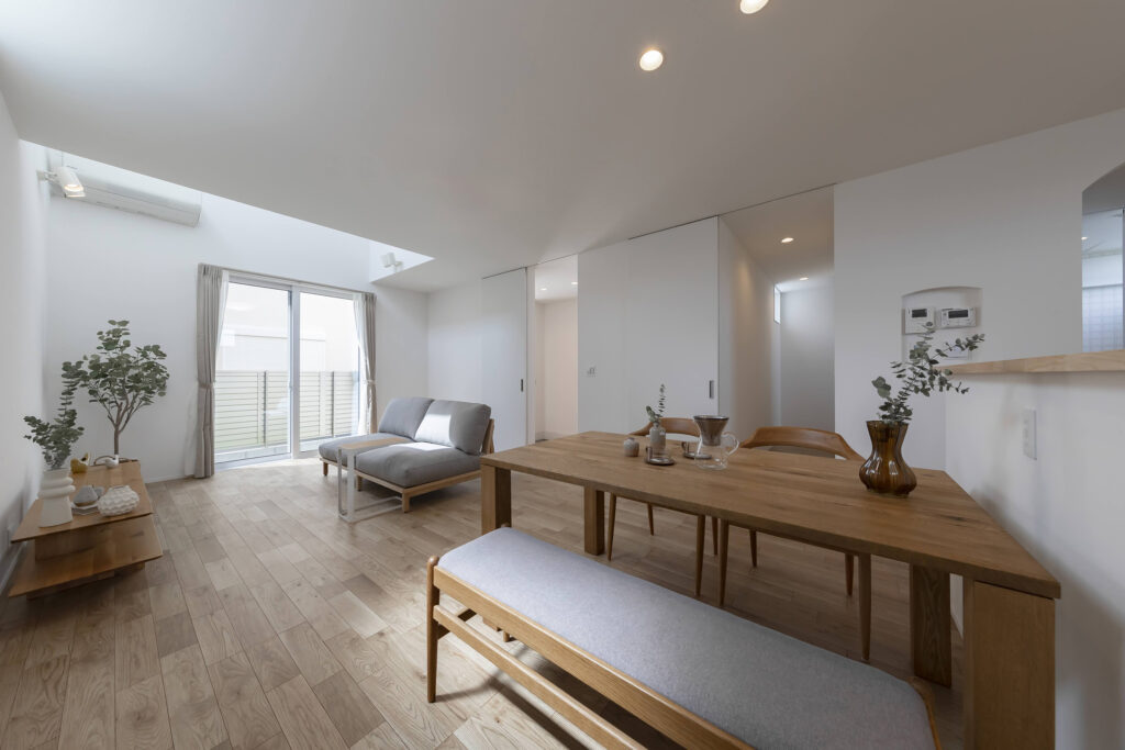 明るい自然光が差し込むシンプルでモダンなLDK。木のぬくもりを感じる家具が配置され、落ち着いた雰囲気を演出