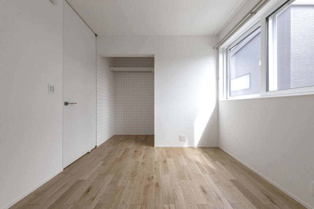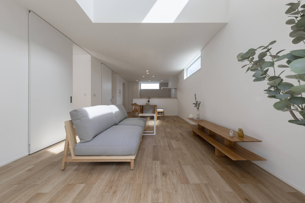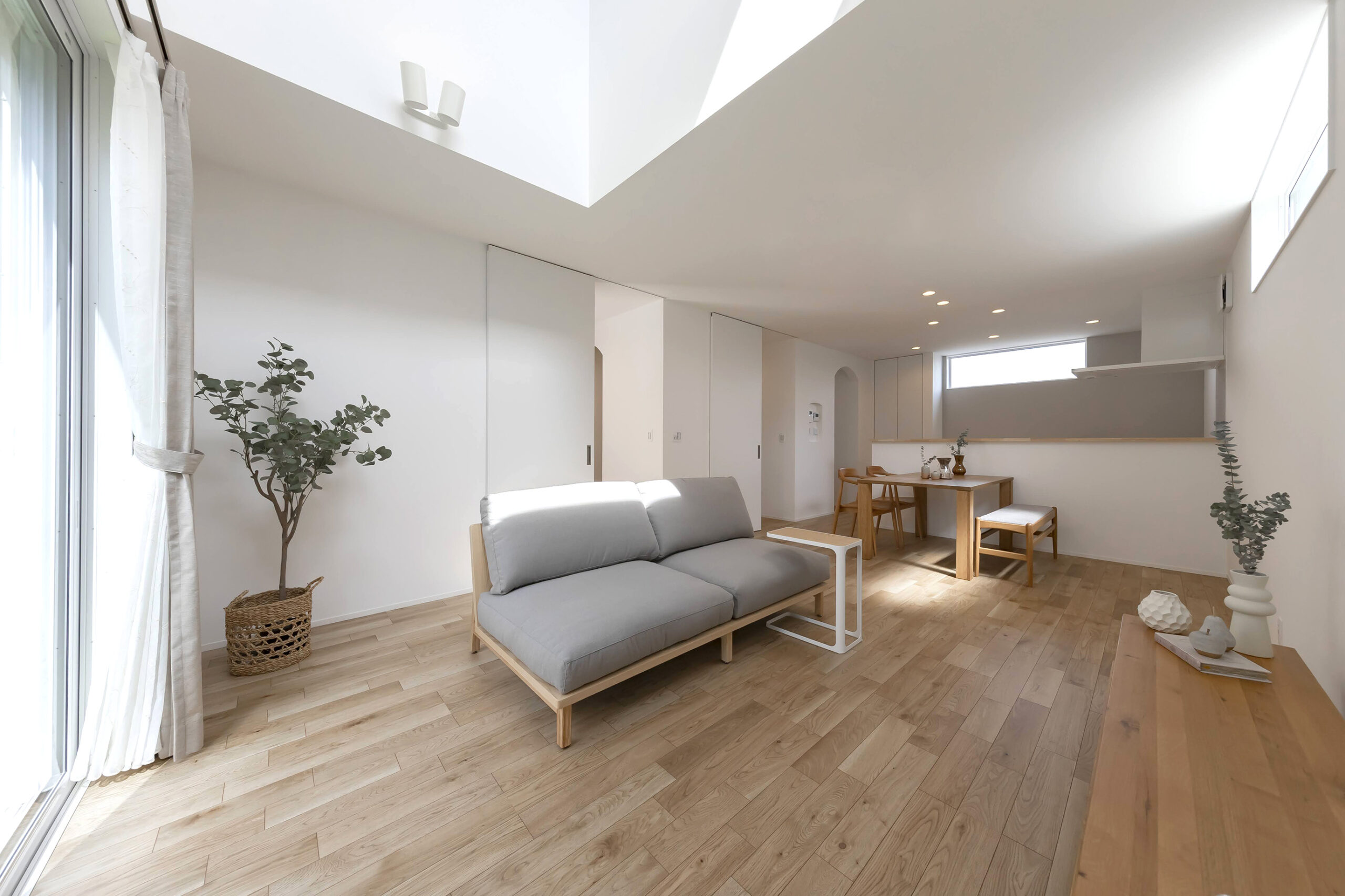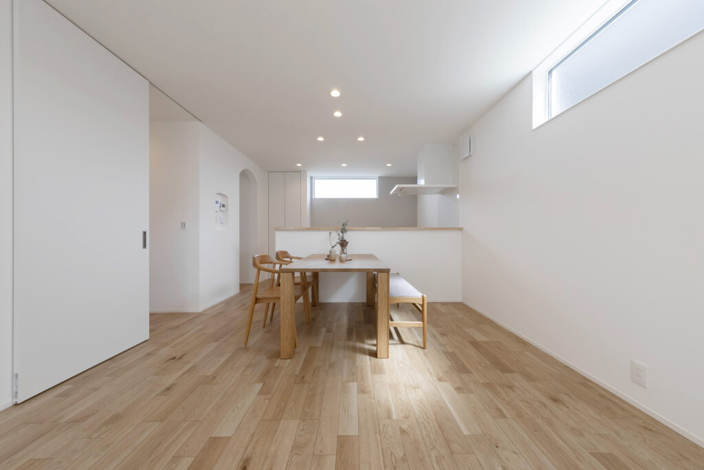 明るい自然光が差し込むシンプルでモダンなLDK。木のぬくもりを感じる家具が配置され、落ち着いた雰囲気を演出